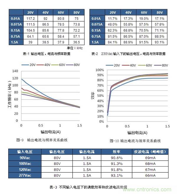 在230Vac的輸入條件,80V、1.5A的條件下得到最高的效率93.1%。詳細數(shù)據(jù)如表-2和圖-10所示。表-3是全電壓范圍下的滿載效率和紋波電流數(shù)據(jù)。可以看出紋波電流的表現(xiàn)也很優(yōu)秀,峰-峰值小于2.5%,都在70mA以下。