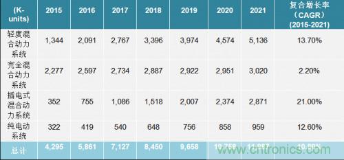 如表1所示,每部車(chē)輛都可能搭載1到4個(gè)電機(jī)。(搭載4個(gè)電機(jī)是出于每個(gè)輪胎都需要一臺(tái)電機(jī))。每臺(tái)使用的電機(jī)都將需要搭配合適的系統(tǒng),以安全高效地驅(qū)動(dòng)與控制這些電機(jī)。這些系統(tǒng)需要具備控制可見(jiàn)性和粒度,以實(shí)現(xiàn)合適的扭矩與電機(jī)控制。牢記電機(jī)與其控制系統(tǒng)需要的知識(shí),表2(同樣來(lái)自Strategy Analytics的報(bào)告)給2015-2021期間市場(chǎng)上的每種類(lèi)型車(chē)輛的數(shù)量一個(gè)估計(jì)值