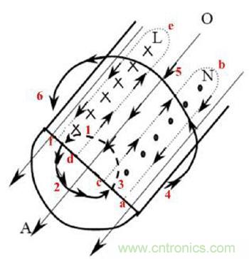 變壓器的鐵損主要由變壓器渦流損耗產(chǎn)生,如圖3所示,給線圈加載高頻電流時,在導(dǎo)體內(nèi)和導(dǎo)體外產(chǎn)生了變化的磁場垂直于電流方向(圖中1→2→3和4→5→6)。根據(jù)電磁感應(yīng)定律,變化的磁場會在導(dǎo)體內(nèi)部產(chǎn)生感應(yīng)電動勢,此電動勢在導(dǎo)體內(nèi)整個長度方向(L面和N面)產(chǎn)生渦流(a→b→c→a和d→e→f→d),則主電流和渦流在導(dǎo)體表面加強(qiáng),電流趨于表面,那么,導(dǎo)線的有效交流截面積減少,導(dǎo)致導(dǎo)體交流電阻(渦流損耗系數(shù))增大,損耗加大。