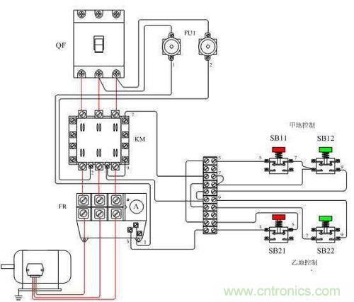 異地控制電動機時,只需要注意,停止按鈕全部串聯(lián),啟動按鈕全部并聯(lián)即可。