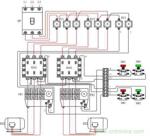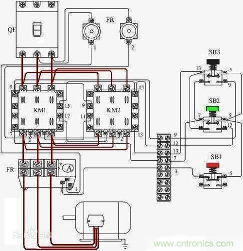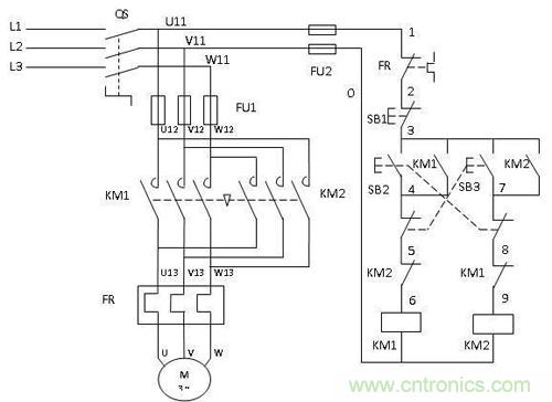 注意看左側的主回路,三項電L1,L2,L3通過接觸器KM1到達電動機M1的順序為左、中、右;而通過接觸器KM2到達電動機M1的順序為右、中、左。相序的改變實現(xiàn)了電機運轉方向的改變。這一用法用在電動汽車或電動三輪車上,即可實現(xiàn)倒車的功能?,F(xiàn)在有一種更方便的元件,叫做“倒順開關”,其原理便是如此。