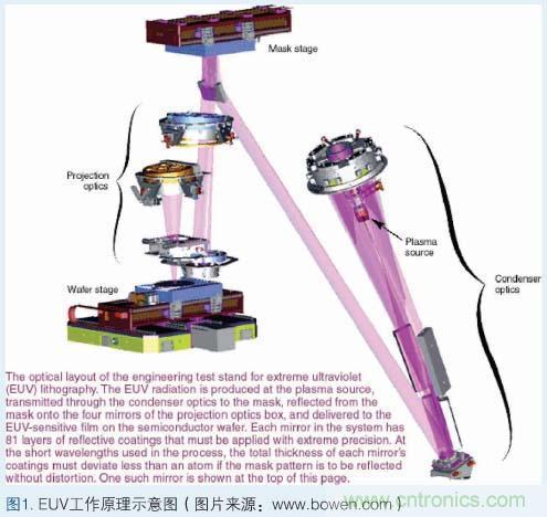 EUV的基本工作原理:激光對準氙氣噴嘴。當激光擊中氙氣時,會使氙氣變熱并產(chǎn)生等離子體;一旦產(chǎn)生等離子體,電子便開始逃逸,從而發(fā)出特定波長的光;接著這種光進入聚光器,然后后者將光匯聚并照到掩膜上;通過在反射鏡的一些部分施加而其它部分不施加吸收體,在反射鏡上形成芯片一個平面的圖案的光學(xué)表示,這樣就產(chǎn)生了掩膜;掩膜上的圖案被反射到四到六個曲面反射鏡上,從而將圖像微縮,并將圖像聚投到硅晶圓上;每個反射鏡使光線稍微彎曲以形成晶圓上的圖像,這就像照相機中的透鏡將光彎曲以在膠片上形成圖像一樣。