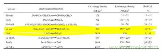 CRABTREE 2015年在The energy-storage frontier : Lithium-ion batteries and beyond中總結(jié)了過去25年松下18650電芯能量密度的變化。經(jīng)過千辛萬苦,現(xiàn)在電芯實(shí)際R占比(Real/Cal.)已經(jīng)達(dá)到了61%左右,實(shí)際電池系統(tǒng)加上管理系統(tǒng)、冷卻系統(tǒng)、引線等,成組實(shí)際能量密度會更進(jìn)一步降低。下表例舉了一部分現(xiàn)有實(shí)際電池能量密度,可憐的明日之星鋰硫電池才10%左右的理論容量發(fā)揮;按照R max = 61%算,理論能量密度最高的鋰空的能量密度大概為3182 Wh/kg。