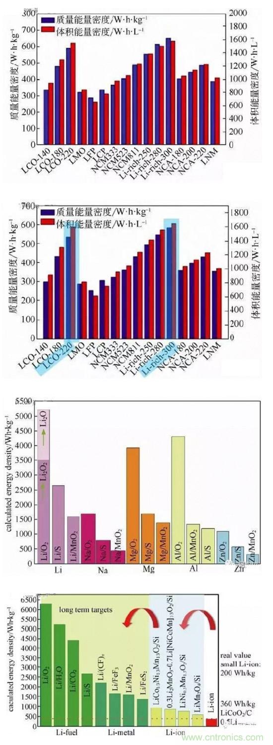 中科院的吳嬌楊博士對于選取了現(xiàn)有理論容量較高、理論容量較低但是商業(yè)化比較成熟等綜合性能比較好的正負(fù)極材料,進(jìn)行正負(fù)極搭配,大致得出了結(jié)果:Li-rich-300 對Si-C-2000 的電芯體系,在所有的電池體系中具有最高質(zhì)量能能量密度584 W·h/kg以及最高體積能量密度1645 W·h/L。該數(shù)值不包括封裝材料與極耳。