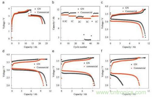 在隨后的倍率實(shí)驗(yàn)中發(fā)現(xiàn),在0.5C、1C和2C的充放電倍率下,實(shí)驗(yàn)組的石墨烯導(dǎo)電劑電池相比于對(duì)照組電池都表出了更高的容量和更小的極化,但是當(dāng)充放電倍率提高到3C時(shí),實(shí)驗(yàn)組電池容量迅速下降到4Ah以下,而對(duì)照組電池的容量仍然保持在9Ah左右,繼續(xù)將放電倍率提高到4C,實(shí)驗(yàn)組石墨烯導(dǎo)電劑電池由于極化太大,已經(jīng)無(wú)法放電,而對(duì)照組電池則相對(duì)穩(wěn)定。