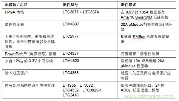 表 1 概述了圖 1 所示 Arria 10 開發(fā)套件電路板的電源軌和功能。該表列出了凌力爾特公司的器件,并描述了每種器件的功能。訪問 www.linear.com.cn/altera,點擊 Arria,了解本文所示兩種電路板的詳細技術(shù)信息。