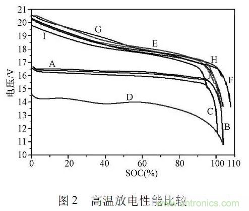 高溫情況下,電池內(nèi)部離子移動速度增大,濃差極化和電化學(xué)極化減輕,極化內(nèi)阻減小,電池內(nèi)部化學(xué)反應(yīng)熱增大,過分高溫會使隔膜發(fā)生收縮,電解液發(fā)生副反應(yīng),造成電池壽命穩(wěn)定性降低GB/T31486要求電池在室溫下充滿電,55℃高溫下儲存5h后評價動力電池的放電容量電池樣品的高溫放電性能比較如圖2所示。