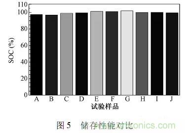 GB/T31486要求動力電池模塊充滿電,室溫下以1C放電30min后,在45±2℃下儲存28天,評價電池的容量恢復(fù)能力電池樣品儲存性能對比如圖5所示。