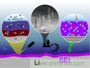 金屬鋰負極應用繞不開的是鋰枝晶的問題,早期人們對于鋰枝晶的認識主要來自于其他金屬電解過程中枝晶產(chǎn)生機理,對于鋰電池內(nèi)鋰枝晶形成機理更多是“猜測”。而在2014年,美國橡樹嶺國家實驗室的Robert L. Sacci等「2」利用原位透射電鏡技術直接在玻璃碳表面觀測到了鋰枝晶的形成過程,從下面的動畫可以看到,不同于傳統(tǒng)的枝晶的概念,鋰枝晶首先以球形出現(xiàn)的,其表面擁有一些納米球,這些納米球具有一定角度的小面,隨后的在一次鋰顆粒的表面進行的二次結晶生長,會產(chǎn)生許多其他形狀的鋰晶體,如球形、多面體和針狀等。