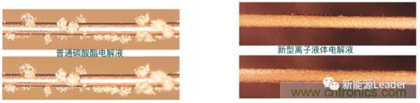 日本三重大學的Hui Wang等「3」開發(fā)了低濃度離子液體電解液,主要由溶解四甘醇二甲醚(G4或者G10H22O5),鋰鹽LiFSI,添加劑1,3-二氧戊環(huán)(DOL)組成,該電解液能夠有效的抑制鋰枝晶產(chǎn)生,在負極表面產(chǎn)生光滑的Li鍍層,提高金屬鋰負極的庫倫效率。鍍鋰后效果如下圖所示,從圖上可以看到采用新型電解液的銅電極表面鋰鍍層均勻分布(右圖),而采用傳統(tǒng)的碳酸酯類電解液的銅電極表面出現(xiàn)了大量的鋰枝晶(左圖)。