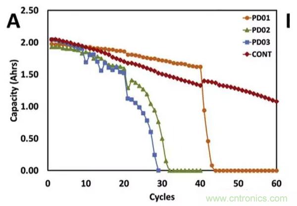 針對三個階段電池的衰降機理的研究認為,階段1可能是因為電池SEI膜生長需要消耗一部分Li+,因此衰降速度較快。在階段2隨著SEI膜結(jié)構(gòu)的穩(wěn)定,內(nèi)部較為穩(wěn)定,因此衰降速度較慢,在階段3隨著電池老化,開始發(fā)生活性物質(zhì)損失,電極活性界面減少,導(dǎo)致電池對于電流十分敏感。圖C是針對不同的截止電壓對電池衰降速度影響的實驗,從實驗結(jié)果可以看到,當(dāng)把充電截止電壓提高到4.3V時會導(dǎo)致電池的循環(huán)性能急劇惡化,降低充電截止電壓可以有效的改善電池的循環(huán)性能。