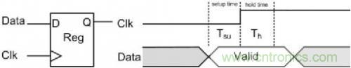 建立時(shí)間(Setup Time)常用Tsu表示,指的是在觸發(fā)器的時(shí)鐘信號(hào)上升沿到來(lái)以前,數(shù)據(jù)和使能信號(hào)穩(wěn)定不變的時(shí)間,如果建立時(shí)間不夠,數(shù)據(jù)將不能在這個(gè)時(shí)鐘上升沿被打入觸發(fā)器,使能信號(hào)無(wú)效,也就是說(shuō)在這個(gè)時(shí)鐘周期對(duì)數(shù)據(jù)的操作時(shí)無(wú)效的;保持時(shí)間(Hold Time)常用Th表示,指的是在觸發(fā)器的時(shí)鐘信號(hào)上升沿到來(lái)以后,數(shù)據(jù)和使能信號(hào)穩(wěn)定不變的時(shí)間,如果保持時(shí)間不夠,數(shù)據(jù)同樣不能被打入觸發(fā)器,對(duì)數(shù)據(jù)的操作同樣是無(wú)效的,使能信號(hào)無(wú)效。數(shù)據(jù)要能穩(wěn)定傳輸,就必須滿足建立時(shí)間和保持時(shí)間的關(guān)系,圖 4標(biāo)識(shí)了它們間的關(guān)系。