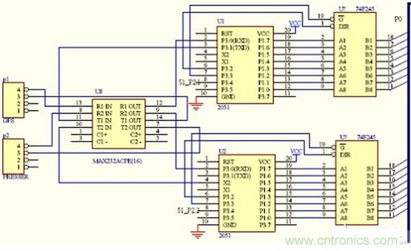 經(jīng)過分析,我們分別使用一塊2051單片機接收各路串口傳感器的數(shù)據(jù),同時使用一塊多路高精度ADC對轉(zhuǎn)換成電壓的溫度等信號采樣,系統(tǒng)結(jié)構(gòu)圖如圖1所示。主從機之間的具體管腳連接參見圖2。