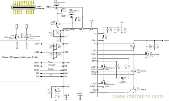 開關(guān)頻率,集成4個(gè)MOSFET驅(qū)動(dòng),采用雙沿電流模式控制,支持輸出預(yù)偏置啟動(dòng),自適應(yīng)死區(qū)時(shí)間控制防止直通,具有獨(dú)立的輸入和輸出電流檢測(cè),輸出電壓(范圍0至20V)可以通過I2C 編程,集成過壓、欠壓、過流和精確的過載保護(hù)等完善的保護(hù)功能,同時(shí)還提供對(duì)5 V Vconn電源的保護(hù)。