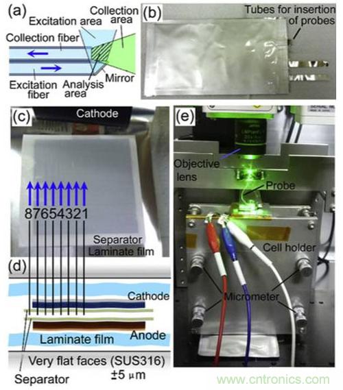 實(shí)驗(yàn)中Toshiro Yamanaka采用了方形疊片電池作為研究對(duì)象,電解液則采用了EC和DEC溶劑,LiClO4作為電解質(zhì)鹽,為了能夠?qū)﹄娦緝?nèi)部電解液的行為進(jìn)行實(shí)時(shí)觀(guān)測(cè),Toshiro Yamanaka在疊片鋰離子電池內(nèi)部引入了8根光纖作為拉曼光譜的探測(cè)器,研究電解液在電池內(nèi)的浸潤(rùn)和離子濃度的變化情況,8根光纖在電池內(nèi)的排布如下圖c所示: