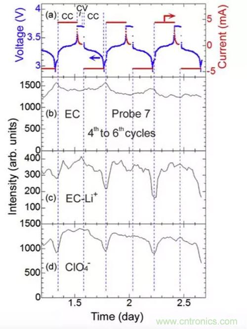受限于技術(shù)手段,以往我們對(duì)于在充放電過(guò)程中電解液在鋰離子電池內(nèi)部的行為缺少直觀(guān)的認(rèn)識(shí),更像是研究一個(gè)黑箱,我們提出各種理論,對(duì)起行為進(jìn)行推測(cè)。為了更加形象和直觀(guān)的研究電解液在鋰離子電池內(nèi)的行為特點(diǎn),日本京都大學(xué)的Toshiro Yamanaka等[2]利用拉曼光譜