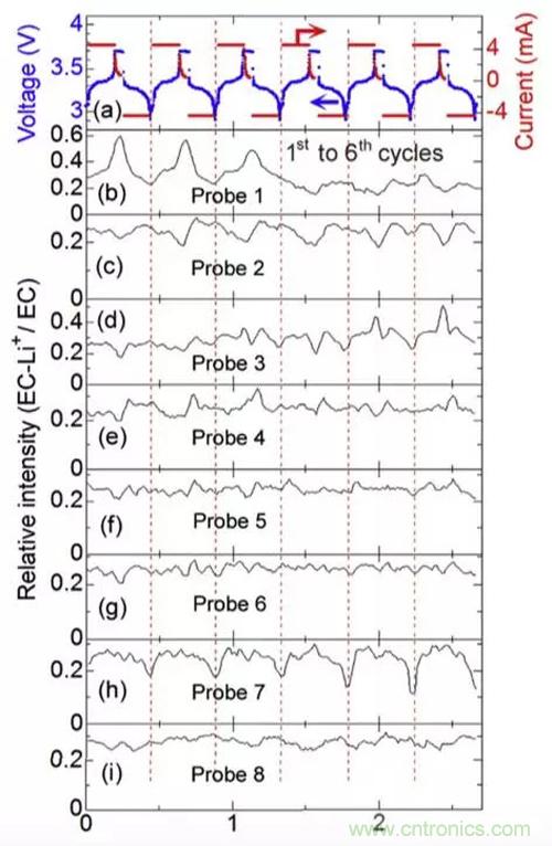 在研究Li+濃度的變化過(guò)程中,Toshiro Yamanaka還發(fā)現(xiàn)電解液的分布也隨著充放電而發(fā)生變化。下圖是在充放電過(guò)程中不同位置溶劑EC的強(qiáng)度的變化趨勢(shì),EC的強(qiáng)度變化主要反映該處電解液的數(shù)量多少,隨著電芯的體積變化,電芯內(nèi)的電解液分布也在不斷的發(fā)生著變化。例如在1號(hào)和2號(hào)位置,EC的濃度發(fā)生了兩次快速下降和緩慢恢復(fù),6號(hào)探測(cè)器的位置,則出現(xiàn)了EC濃度的快速下降和快速上升,這些變化都反映了鋰離子電池內(nèi)部在充放電過(guò)程中,由于電極的體積膨脹,導(dǎo)致電解液在電芯的局部發(fā)生變干、再浸潤(rùn)的過(guò)程。