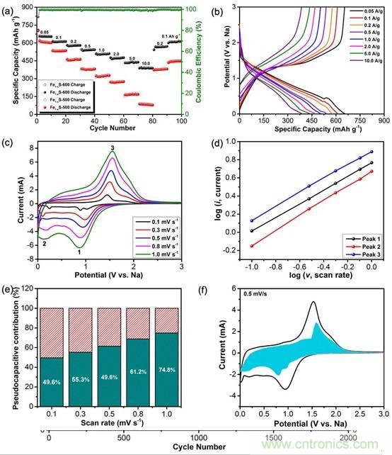 Fe1-xS納米材料的(a)倍率性能曲線;(b)相應(yīng)倍率下充放電曲線;(c)不同掃速下的CV曲線;(d)相應(yīng)氧化還原峰下的log i vs. log v曲線;(e)不同掃速下的贗電容貢獻;(f)掃速為0.5 mV s-1時,CV曲線及相應(yīng)贗電容所占比例。