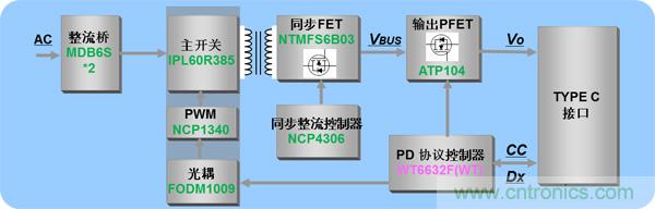 該設(shè)計(jì)主要采用安森美半導(dǎo)體的初級(jí)端高頻準(zhǔn)諧振反激式PWM控制器NCP1340、次級(jí)端同步整流控制器NCP4306、同步FET NTMFS6B03、開關(guān)FET ATP104和偉詮的PD3.0協(xié)議控制器WT6632F/WT6615F。方案框圖如圖1所示。