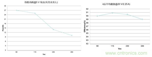 我們?cè)?0 Vac、115 Vac、230 Vac、264 Vac 條件下,測(cè)得該方案于5 V輸出(電纜未插入)的待機(jī)功耗都低于27 mW,在評(píng)估板端測(cè)得在115 Vac和230 Vac的條件下,20 V/2.25 A輸出的平均能效超過90%。