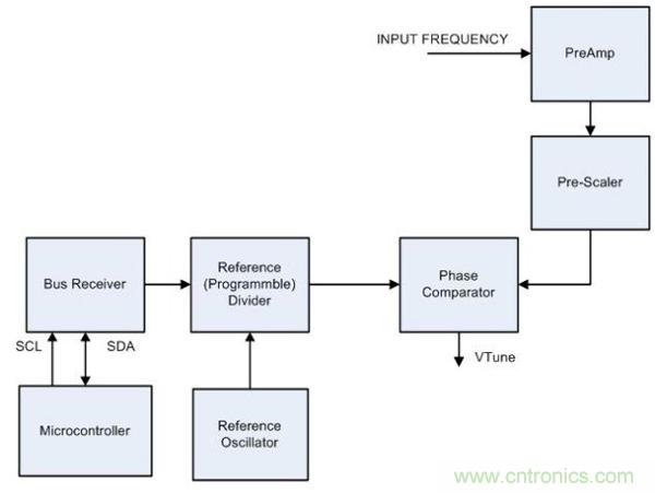 微控制器通過 I2C 發(fā)送數(shù)據(jù)到可編程分頻器。該分頻器也接收來自參考振蕩器(例如 4 MHz 晶體振蕩器)的輸入。相位比較器(即相位檢測器)通過預(yù)分頻器接收本地振蕩器頻率(例如 87.15 MHz),還通過參考分頻器和參考振蕩器接收微控制器的輸入(例如,87.15 MHz)。如果兩個輸入都匹配,相位比較器將提供 Vtune 調(diào)諧電壓。一旦本地振蕩器頻率與微控制器頻率數(shù)據(jù)之間稍有不匹配,都將無法提供調(diào)諧電壓 (Vtune) 和輸出。圖 3 所示為完整的框圖。