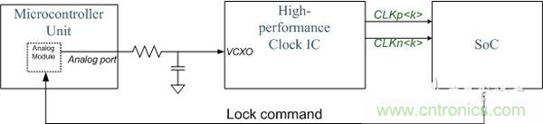 對某些應(yīng)用而言,輸出時鐘頻率應(yīng)通過使用模擬反饋跟蹤輸入數(shù)據(jù)流。如圖 5 所示,時鐘 IC 作為大鎖相環(huán)的一部分。ASIC 或 SoC 負責(zé)跟蹤輸入流、計算誤差并產(chǎn)生 PWM 信號(通常來說),隨后將誤差信息反饋至本地時鐘發(fā)生器以進行頻率調(diào)諧。