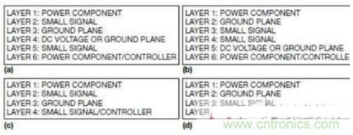 圖1a和1c分別是六層和四層開關(guān)電源PCB的不良層結(jié)構(gòu)。這些結(jié)構(gòu)將小信號(hào)層夾在大電流功率層和地層之間,因此增加了大電流/電壓功率層與模擬小信號(hào)層之間耦合的電容噪聲。
