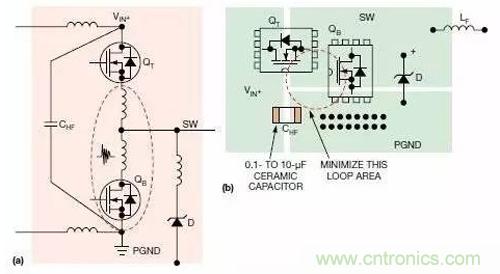 圖4顯示的是升壓轉(zhuǎn)換器中的連續(xù)電流回路與脈沖電流回路。此時(shí),應(yīng)在靠近MOSFET QB與升壓二極管D的輸出端放置高頻陶瓷電容CHF.