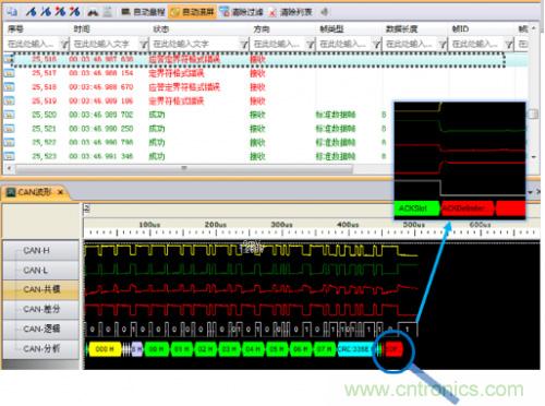 為什么會(huì)發(fā)生這種錯(cuò)誤呢?發(fā)送報(bào)文的節(jié)點(diǎn)會(huì)在ACK段發(fā)送兩個(gè)隱性位,若在第一個(gè)位期間接收到顯性電平則認(rèn)為該幀被正確接收。由于仲裁段相同時(shí)兩節(jié)點(diǎn)都認(rèn)為自己取得仲裁權(quán),在ACK段等待應(yīng)答,但該網(wǎng)絡(luò)中僅存在兩個(gè)節(jié)點(diǎn),因此在ACK段不能收到應(yīng)答,進(jìn)而發(fā)生應(yīng)答定界符錯(cuò)誤。簡(jiǎn)單說來這種情形就類似于總線中只有一個(gè)節(jié)點(diǎn)將不能實(shí)現(xiàn)數(shù)據(jù)發(fā)送。圖7是在ACK段有無應(yīng)答時(shí)的波形對(duì)比。