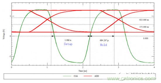 上面的波形我們似乎看不出時鐘與地址之間的時序關(guān)系是什么樣的,我們把它放在一個眼圖中,時序關(guān)系就很明確了。這里粗略的計算下建立時間與保持時間。如下圖