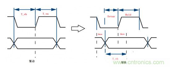 上圖中,T_vb與T_va表示的是主控芯片在輸出數(shù)據(jù)時時鐘與數(shù)據(jù)之間的時序參數(shù)。在理想情況下,時鐘邊沿和數(shù)據(jù)電平的中心是對齊的,由于時鐘和數(shù)據(jù)傳輸通道不等長,使得時鐘邊沿沒有和數(shù)據(jù)脈沖的中間位置對其,使得建立時間的裕量變小。在理解了這些基礎(chǔ)問題之后,我們需要做的就是將這些時間參數(shù)轉(zhuǎn)化為線長。