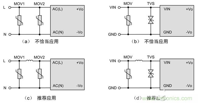 電源模塊體積小,在EMC要求比較高的場合,需要增加額外的浪涌防護(hù)電路,以提升系統(tǒng)EMC性能。如圖1所示,為提高輸入級的浪涌防護(hù)能力,在外圍增加了壓敏電阻和TVS管。但圖中的電路(a)、(b)原目的是想實現(xiàn)兩級防護(hù),但可能適得其反。如果(a)中MOV2的壓敏電壓和通流能力比MOV1低,在強(qiáng)干擾場合,MOV2可能無法承受浪涌沖擊而提前損壞,導(dǎo)致整個系統(tǒng)癱瘓。同樣的,電路(b),由于TVS響應(yīng)速度比MOV快,往往是MOV未起作用,而TVS過早損壞。
