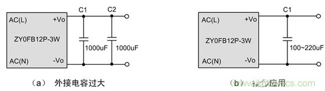 如圖2中的電路(a)所示,一個3W的模塊,輸出使用了2000uF的電容,而通過查閱產(chǎn)品手冊了解到,模塊建議最大輸出電容為800uF。輸出電容過大可能導(dǎo)致啟動不良,而對于不帶短路保護(hù)的微功率DC-DC模塊,輸出電容過大甚至可能導(dǎo)致模塊永久損壞。