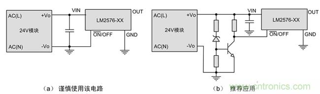 因此推薦使用電路(b),外置簡單的欠壓鎖定,使24V模塊輸出電壓建立到預(yù)置值后再啟動LM2576等外接開關(guān)電源芯片,可以很大程度上避免啟動不良問題。
