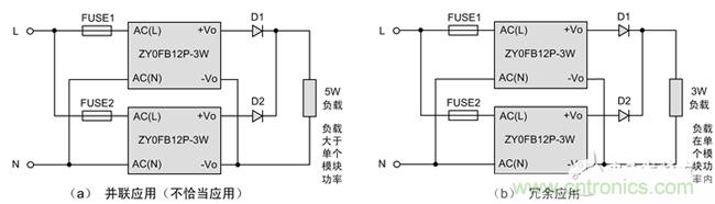 如上圖電路(a)所示,負(fù)載需5W功率,超出單個模塊的帶載能力,則其中一個模塊可能存在超負(fù)荷使用的情況。對于此種應(yīng)用,需使用單個大于5W功率的模塊,比如ZY0JGB12P-10W。而電路(b)則不然,每個模塊的功率均能滿足負(fù)載的需要,此時屬于冗余設(shè)計。
