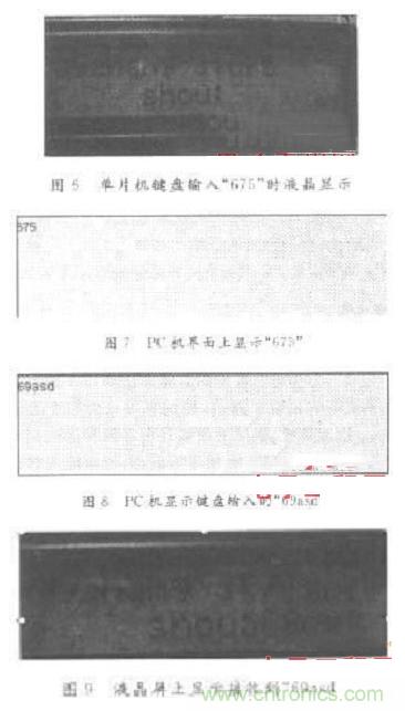 測試時,連接好硬件打開串行口COM1,并設(shè)波特率為9600b/s.單片機(jī)發(fā)送字符串“675”給PC機(jī),其液晶顯示如圖6所示,相應(yīng)的PC機(jī)界面顯示如圖7所示。PC機(jī)發(fā)送“69asd”給單片機(jī),液晶屏上即可接收到“69asd”,如圖8,圖9所示。測試結(jié)果說明:基于串行口的PC機(jī)與單片機(jī)之間的雙工無線通信是切實可行的,而且無線傳輸?shù)木嚯x至少可達(dá)到100m.