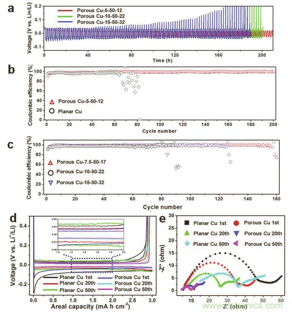 b)鋰沉積在平板銅及多孔Cu-5-50-12時的循環(huán)穩(wěn)定性能及庫倫效率