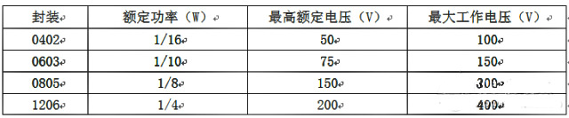 先來看看某廠家四種常用封裝電阻的參數(shù)表。其中表中有兩個值:額定工作電壓和最大工作電壓?!?