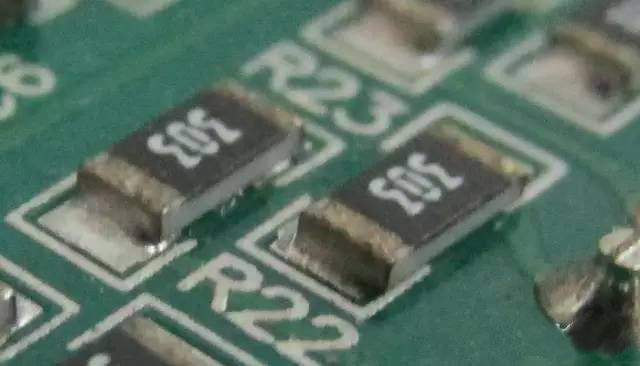 下圖是兩顆電極氧化了的貼片電阻(電極表面有點黑),別看它們現(xiàn)在好好的,一旦電路進入了惡劣的工作狀態(tài)(高溫高濕),電阻就會因為虛焊而使電路工作在不可預(yù)測的狀態(tài),繼而損壞。