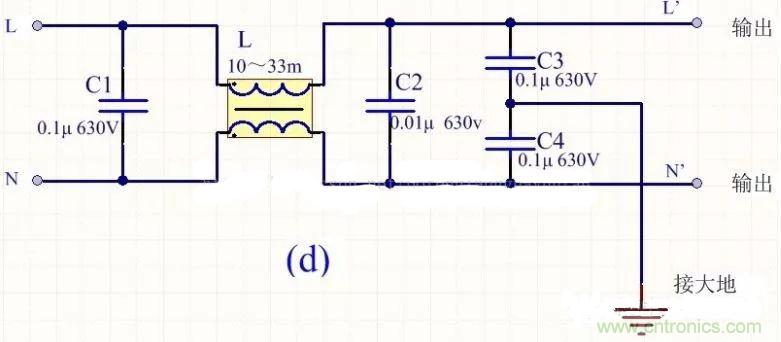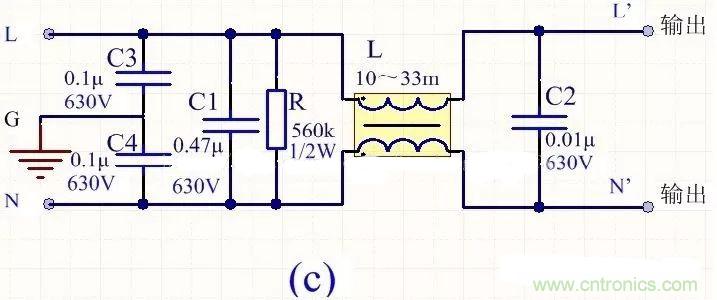 為降低成本和減小體積,開關(guān)電源一般采用簡(jiǎn)易的EMI濾波器,主要包括共模扼流圈L和濾波電容,以下四種可以根據(jù)情況進(jìn)行選擇: