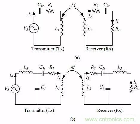 圖1:無線輸電(WPT)設(shè)計中所用補償電路拓撲有四種,這里是其中兩種:(a)SS拓撲,(b)LCL-LCL拓撲。