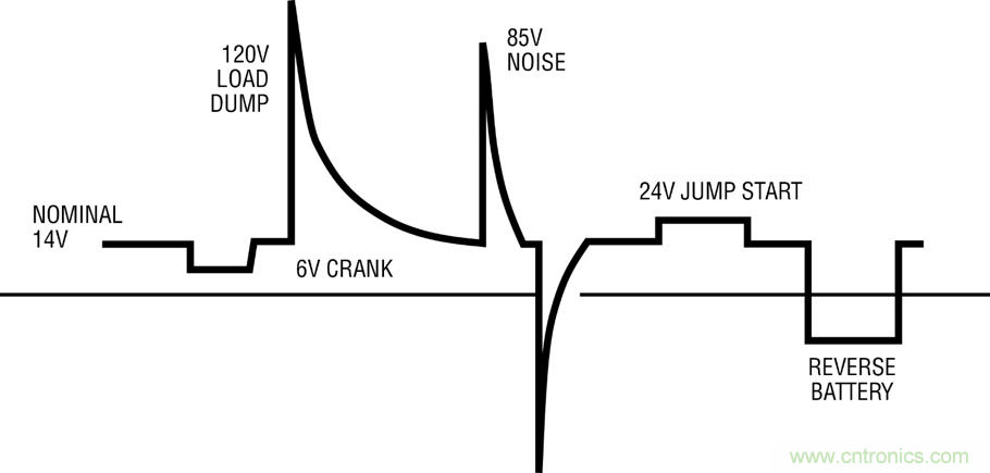 交通運(yùn)輸系統(tǒng)的輸入電壓可能高達(dá) 14V (單電池供電汽車)、28V (雙電池供電卡車、客車和飛機(jī))、或更高電壓,而其數(shù)字系統(tǒng)需要一個(gè)或更多個(gè)低壓軌。因此,設(shè)計(jì)這類系統(tǒng)時(shí),需要了解怎樣才能簡(jiǎn)便、高效和可靠地從很高的輸入電壓降壓。以下圖 1 顯示,汽車環(huán)境中的輸入電壓可能視其運(yùn)行狀態(tài)的改變而改變,而其運(yùn)行狀態(tài)可能包括負(fù)載突降變化到冷車發(fā)動(dòng)的各種情況,甚至出現(xiàn)電池反向連接。