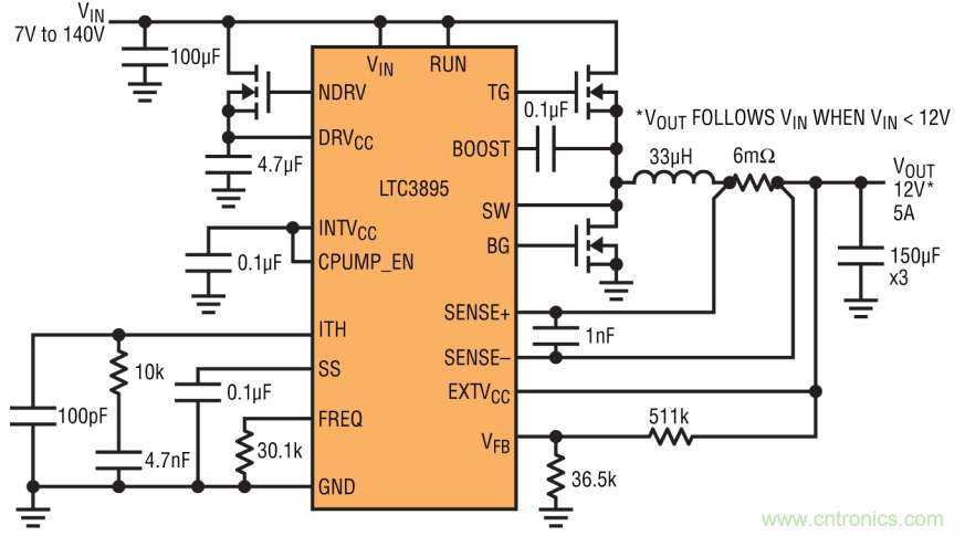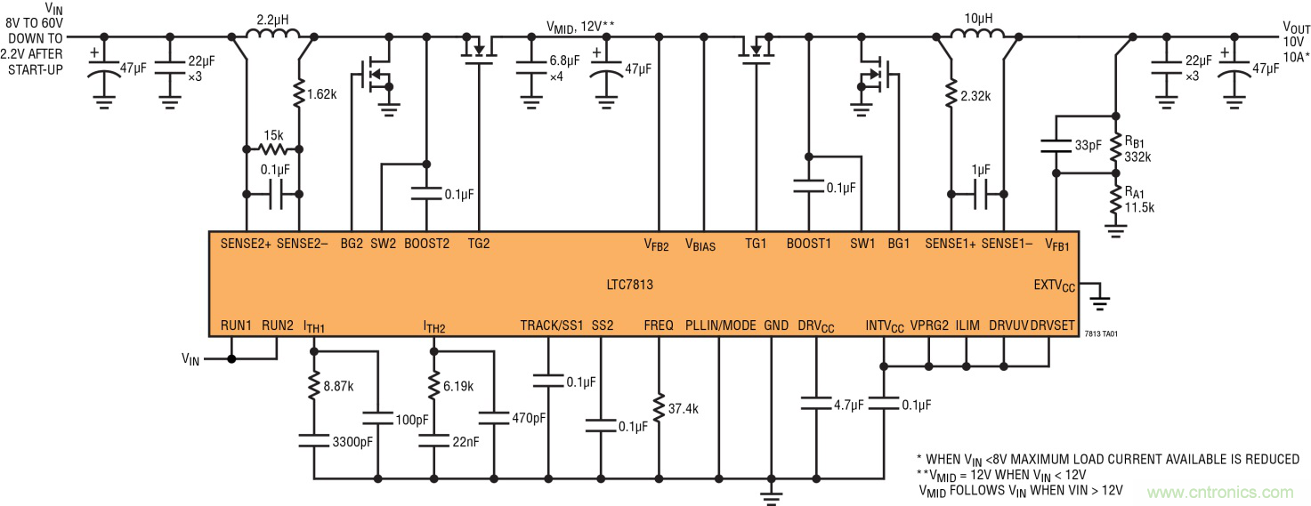 解決汽車?yán)滠嚢l(fā)動(dòng)問(wèn)題的另一種方法是,采用升壓型轉(zhuǎn)換器,后面再跟一個(gè)降壓型轉(zhuǎn)換器。在這種拓?fù)渲校瑥膯坞姵靥峁┑纳龎盒娃D(zhuǎn)換器之輸出設(shè)定為比電池的標(biāo)稱電壓高出幾伏,然后再用一個(gè)降壓型轉(zhuǎn)換器對(duì)其降壓,使其達(dá)到下游電子組件所需的工作電壓。盡管這種方法需要兩個(gè)轉(zhuǎn)換器,但是ADI公司已經(jīng)開(kāi)發(fā)出一款整合了升壓型控制器和降壓型控制器的器件,兩個(gè)控制器既可獨(dú)立使用,又可作為升壓-降壓跟隨器使用。圖 5 中用LTC7813 說(shuō)明這種器件的工作原理。