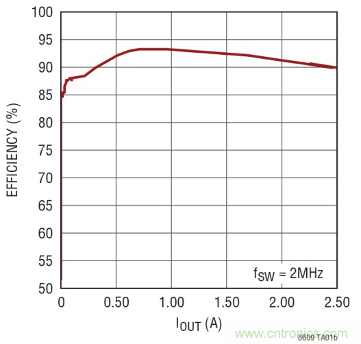 一個(gè)很好的例子是 LT8609,這是一款 2A、42V 輸入同步降壓型開(kāi)關(guān)穩(wěn)壓器。獨(dú)特的同步整流拓?fù)涮峁?93% 的效率,而以 2MHz 頻率切換使設(shè)計(jì)師能夠避開(kāi)關(guān)鍵噪聲敏感頻段,例如 AM 無(wú)線電,同時(shí)可提供占板面積非常緊湊的解決方案。突發(fā)模式 (Burst Mode®) 運(yùn)行在無(wú)負(fù)載備用情況下保持靜態(tài)電流低于 2.5μA,從而使該器件非常適合始終保持接通的系統(tǒng)。LT8609 的 3.0V 至 42V 輸入電壓范圍使其非常適合汽車應(yīng)用,這類應(yīng)用必須以低至 3.0V 的最低輸入電壓穩(wěn)定通過(guò)冷車發(fā)動(dòng)和停-啟情況,并穩(wěn)定通過(guò)超過(guò) 40V 的負(fù)載瞬態(tài)。其內(nèi)部 3.5A 開(kāi)關(guān)可在峰值負(fù)載電流為 3A 時(shí),提供高達(dá) 2A 的連續(xù)輸出電流。原理圖和相應(yīng)于 2MHz 切換頻率的效率曲線如圖 3 所示。