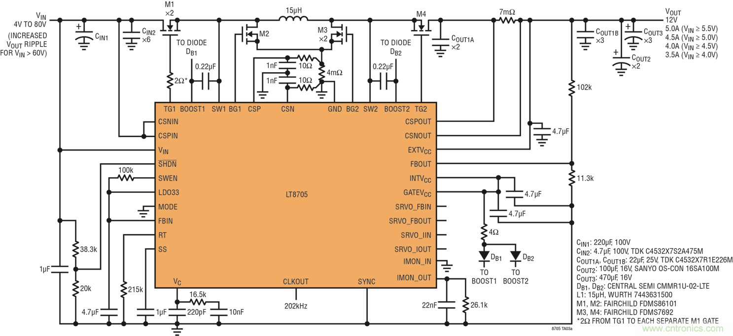 圖 4:詳細(xì)的 LT8705 原理圖,從 4V 至 80V 輸入提供固定 12V 輸出
