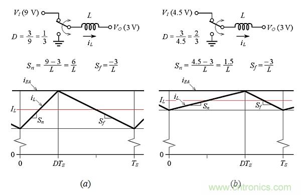 圖3所示電路存在兩個缺陷。第一個缺陷如圖5所示,是將VO調(diào)節(jié)為3.0V的轉(zhuǎn)換器設(shè)計(為簡單起見,假設(shè)周期在t = 0時開始)。圖4a示出了在VI=9V條件下,穩(wěn)態(tài)電感器電流iL和其平均值IL,對應(yīng)于D = 3/9 = 1/3的占空比。假設(shè)現(xiàn)在VI下降到4.5V,則對應(yīng)D = 3 / 4.5 = 2/3的占空比。假設(shè)vEA沒時間發(fā)生顯著變化,那么平均電感器電流iL將增加,如圖5b所示。這是因為當下坡Sf在-3/L保持恒定時,上坡Sn從(9-3)/L減小到(4.5-3)/L,即從6/L減少到1.5/L。