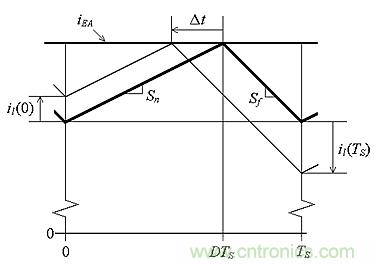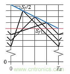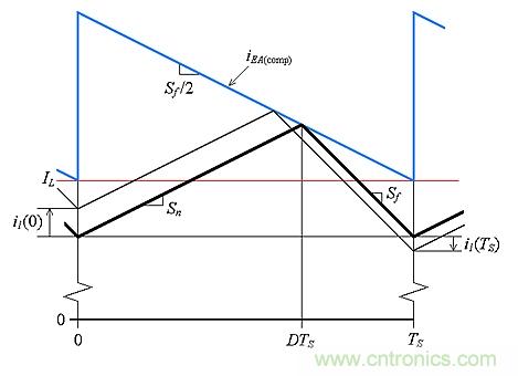 第二個缺陷是稱為次諧波振蕩的不穩(wěn)定形式,當D>0.5時會產(chǎn)生這種不穩(wěn)定。圖6顯示了周期開始時電感電流擾動il(0)如何在周期結(jié)束時演化為擾動il(TS)。例如,擾動可能由前一周期中比較器失能引起。借助簡單的幾何,我們可以得出il(0)/△t = Sn和il(TS)/△t = Sf。消除△t,得出: