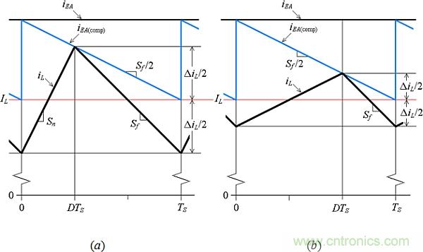 圖9給出了修改圖3的電路以實現(xiàn)斜率補償?shù)囊环N方法。該電路現(xiàn)在包含一個以fS頻率工作的鋸齒波發(fā)生器,從vEA中減去其輸出vRAMP,產(chǎn)生iL所期望的峰值軌跡。使用斜率補償,圖5的波形如圖10所示變化,其中iEA(comp) = (vEA– vRAMP)/Ri。