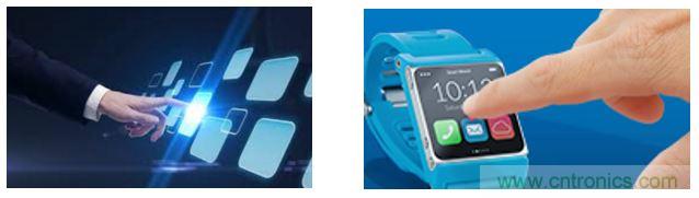電容式觸摸顯示屏 ─觸摸顯示屏為中型及大型的物聯(lián)網(wǎng)設備提供豐富的用戶界面。從微波爐到手持式醫(yī)療設備,從智能手表到工業(yè)控制器等等。通常,使用電容觸摸技術結合顯示屏上透明的銦錫氧化物層(ITO)來實現(xiàn)觸摸顯示屏。依據(jù)這種應用方式,電容式觸控技術要求能夠在潮濕的環(huán)境下工作。