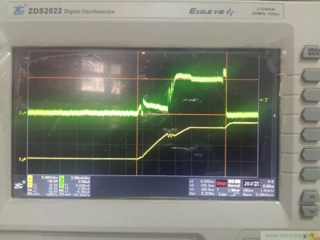 如下圖3所示,為圖2電路的實(shí)驗(yàn)波形圖,綠色為IE電流波形,黃色為VDD電壓波形(示波器采用zlgZDS2022)。從圖中可看出開關(guān)電源啟動可分三個階段,第一階段,在上電時IE以近似1mA的電流向電容C充電,當(dāng)VDD電壓達(dá)到UCC28C40門限電壓時進(jìn)入第二階段,此時飽和電流增加至5mA,在為IC供電的同時繼續(xù)為電容充電,當(dāng)輸出電壓建立后進(jìn)入第三階段,此時IE電流為零,啟動電路停止工作,VDD電壓上升至輔助繞組電壓。在啟動的整個過程中,IE的電流都是比較小而且比較平緩,所以該電路安全可靠。